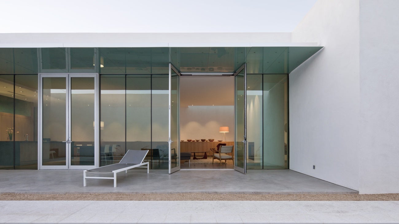 Courtyard microclimates: The home's interior is sheltered by perimeter walls that define two courtyards, each benefiting from year-round shade that tempers the surrounding environment. In the main courtyard, a lap pool brings cooling through evaporation, moderating the hot, arid outdoor temperatures. In the smaller courtyard adjacent to the primary bedroom, lush native desert plantings—nourished by harvested rainwater—offer a similar cooling effect.