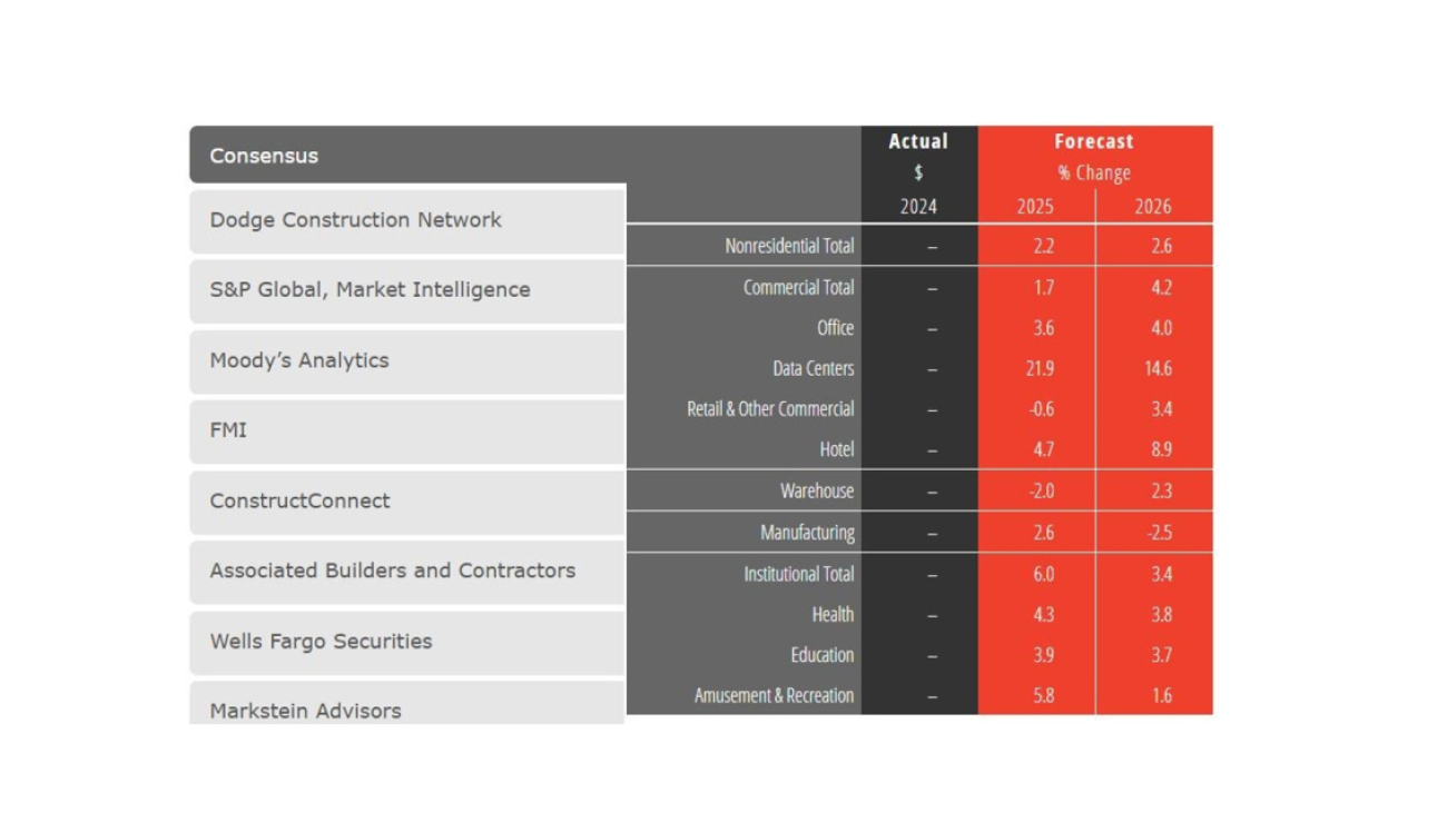 Within the commercial sector, spending on offices is expected to increase modestly this year and next. Spending on retail and other commercial facilities will see no gains this year before a modest uptick in 2026. Hotels are expected to see mid-single-digit growth this year and high single-digit growth next year.